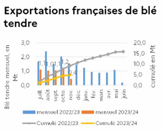 La campagne a pourtant mal commencé, avec un retard marqué des ventes entre juillet et novembre par rapport à 2022-2023. En cause toujours, la compétitivité des origines mer Noire et particulièrement de la Russie, dont le disponible exportable, estimé à 50 millions de tonnes, lui permet d’alimenter le marché abondamment.