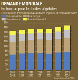 La consommation mondiale en huile progresse en effet de près de 5 % sur un an pour atteindre 192 millions de tonnes sur la campagne de 2023-2024. Elle est soutenue par des besoins en hausse pour la production de biodiesel notamment. En toile de fond, le regain de tension au Moyen-Orient entretient la pression sur les marchés de l’énergie et des prix du pétrole proches de 80 USD le baril à New York. L’ensemble du complexe d'huiles mondial (soja, colza, tournesol et palme) affiche une corrélation forte et tout déséquilibre de marché sur l’une d’elles pourrait influencer les autres. Cette hausse de la demande ne laisse que peu de place pour la reconstruction des stocks.