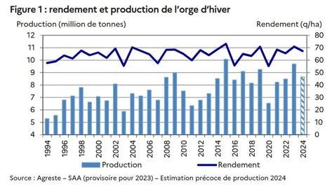 - L’orge d’hiver : 67,3 q/ha (–5,1 % par rapport à 2023). « Cette diminution du rendement, conjuguée à celle des surfaces (–5,9 %), tire la production vers le bas, à 8,6 millions de tonnes (–10,7 %) », précise Agreste.