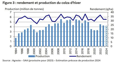 - Le colza : 31,6 q/ha (–0,2 % par rapport à 2023). La production, estimée à 4,2 millions de tonnes, « serait également en baisse par rapport à 2023 (–1,2 %), mais en nette hausse par rapport à la moyenne de 2019 à 2023 (+11,5 %) ».