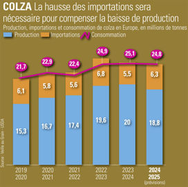 De son côté, la consommation se maintiendra autour des 25 millions de tonnes. Le bilan européen est traditionnellement déficitaire et les acheteurs se tournent vers les importations mondiales pour répondre à leurs besoins. Pour compenser la chute de la récolte, les importations atteindront un niveau soutenu.