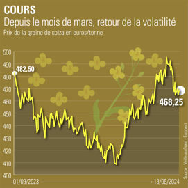 Face à cette incertitude, le marché de la graine de colza sur Euronext affiche une grande volatilité, au gré des annonces. Sur l’échéance rapprochée, après avoir frôlé les 500 €/t à la fin de mai, les cours s’affichaient à 470 €/t le 14 juin dernier. Malgré cette correction récente des prix, le déficit européen et ukrainien devrait favoriser la fermeté des cours dans les prochaines semaines.