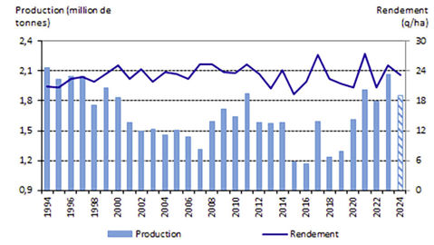 La baisse des surfaces et de la production serait davantage marquée par rapport à la moyenne quinquennale 2019-2023 : -12,5 % et -8,7 %.