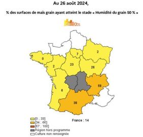 Le stade floraison est atteint à 100 % avec en moyenne onze jours de retard par rapport à 2023 et à la moyenne quinquennale. Le stade humidité du grain des maïs à 50 % est passé, quant à lui, en une semaine de 7 % à 14 % (33 % en 2023 et 37 % sur la moyenne des cinq années précédentes).
