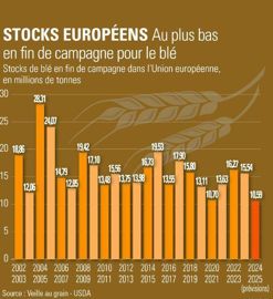 Les stocks de blé en Europe pourraient chuter à 11 millions de tonnes en juin prochain, selon l’USDA, soit l’un des niveaux les plus bas depuis vingt ans. En parallèle, la baisse de la parité entre l'euro et le dollar, descendue à 1,02 depuis novembre, favorise la compétitivité des origines européennes sur le marché international et contribue à redynamiser les exportations.