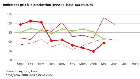 À partir de mars, les prix deviennent inférieurs à la moyenne quinquennale de 2020-2024, la demande restant en deçà de l’offre qui pâtit par ailleurs de la concurrence belge. Ces prix, encore plus faibles en avril, ont incité certains producteurs à mettre précocement un terme à leur campagne, « malgré un stock de racines disponible », précise Agreste. En mai, les prix des endives remontent légèrement bien qu’ils restent inférieurs de 42 % par rapport au pic de mai 2024 et de 11 % par rapport à la moyenne des prix de 2020-2024 sur le même mois.