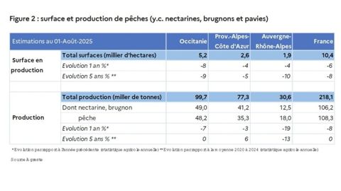 Toutes les régions sont concernées par cette baisse, mais la plus touchée est la Vallée du Rhône. « Violents orages en juin, chutes de fruits en mai, gel en mars et réduction des surfaces impactent la production, estimée en nette baisse sur un an (–19 %) et par rapport à la moyenne de 2020 à 2024 (–13 %) », indique la note. S’ajoute la canicule de juillet qui a « freiné le grossissement des fruits en améliorant leur qualité ». 30 600 tonnes ont été produites au total sur la région.