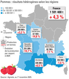 La récolte française de poires recule de 2 % par rapport à 2024. Avec cette offre limitée, les prix en septembre ont augmenté de 10 % sur un an et de 14 % par rapport à la moyenne de 2020-2024. à l’inverse, la production de pommes, est annoncée en léger repli, 4 % en dessous de son niveau de 2024. Les prix étaient moins élevés en septembre 2025, de l’ordre de 4 % par rapport à 2024, mais dépassaient de 6 % leur moyenne quinquennale de 2020-2024.