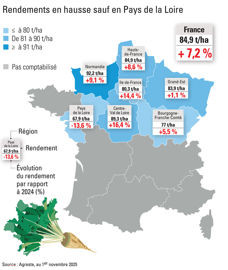 À 33,7 millions de tonnes, la production française de betteraves industrielles serait en hausse de 3,5 % en 2025 par rapport à la campagne précédente, et de 8,7 % par rapport à la moyenne quinquennale 2020-2024. Alors que les surfaces reculeraient de 15 000 hectares sur un an, à 397 000 hectares contre 412 000 hectares en 2024, les rendements progresseraient pour atteindre 84,9 t/ha, contre 79,2 t/ha en 2024. Ces rendements s’avèrent néanmoins hétérogènes à cause de la pression de la jaunisse et du déficit hydrique.
