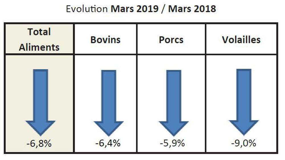 Sur le premieer trimestre de 2019, les aliments bovins sont la seule catégorie en hausse (+1,3 %) alors que la baisse en aliments volailles s’accélère (–4,3 %) avec néanmoins une stabilité en aliments pour palmipèdes (-0,4 %). En aliments pour porcins, la perte de volume se limite à 20 900 tonnes.