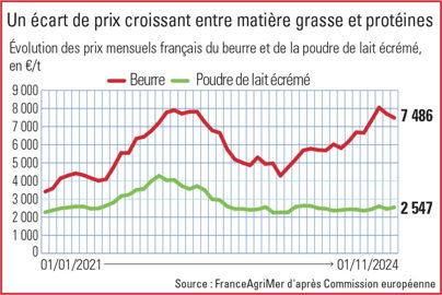 S’agissant du prix du lait, une baisse de 1,6 % s’est opérée sur les neuf premiers mois de l’année dans l’Hexagone (prix standard). Il augmente cependant de nouveau depuis juillet, ce qui devrait atténuer la diminution constatée sur douze mois en 2024. En moyenne de janvier à septembre, le prix du lait conventionnel à teneurs réelles s’établissait à 480 €/1 000 l en France.