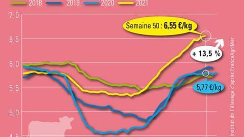 En semaine 50 (du 13 au 19 décembre 2021), la cotation du veau rosé clair O élevé en atelier atteint 6,55 €/kg de carcasse, soit 78 centimes de plus qu’en 2020. « La hausse est similaire pour la cotation du veau R qui a bondi de 19 centimes en quatre semaines, à 6,90 €/kg en semaine 48 (+ 8 %/2020 et + 9,5 %/2019) », rapporte l’Institut de l’élevage (Idele).