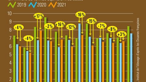 En novembre, les abattages d’agneaux accusaient une légère baisse (- 1 %). « Si, sur les onze premiers mois de 2021, la France parvient à maintenir le niveau de ses abattages (+ 2 % par rapport à 2020), c’est en raison d’importations dynamiques d’agneaux vivants, notamment en provenance d’Espagne », souligne l’experte.