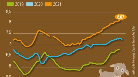Les tarifs restent néanmoins sur un niveau élevé. « Ils ont atteint un nouveau record en décembre 2021 en dépassant le seuil de 8 €/kg de carcasse (1). Lors de la semaine 52, il s’affichait à 8,07 € », précise Cassandre Matras, de l’Institut de l’élevage. Dans le même temps, l’indice Ipampa ovin (prix des charges supportées par les exploitations) a fortement augmenté. En novembre 2021, il s’établissait à 119 points, soit 13,6 points supplémentaires par rapport à 2020. »