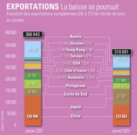 Ces difficultés sont aussi observées dans les autres principaux pays producteurs de l’Union européenne. Entre manque d’offre et prix soutenus, se faire une place à l’exportation s’avère également laborieux. « Les viandes mises sur le marché par les États-Unis, le Canada ou le Brésil sont plus compétitives », observe Pascal Le Duot, le directeur du cadran de Plérin. Après avoir reculé de 16,5 % en 2022, les exportations européennes poursuivent leur déclin en janvier 2023. « En dehors du Japon et de la Côte d’Ivoire, les principaux débouchés sont en repli », note le MPB.