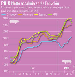 L’ascension continue du prix de base du porc en France a pris fin, pour le moment. Elle trouvait son origine entre janvier et le début de mars dans un net recul de l’offre : –6,2 % sur un an au premier trimestre dans la zone Uniporc Ouest. La hausse des cours a d'abord laissé place à une stabilisation entre la mi-mars et la mi-avril aux alentours de 2,38 €/kg. La cotation au Marché du porc breton (MPB) a ensuite commencé à s'éroder. Face au manque de porcs, « les professionnels ont anticipé leurs achats avant Pâques, et désormais, ils résistent face à de nouvelles hausses de prix », analyse Elisa Husson, ingénieure d’études économiques à l’Institut du porc (Ifip), dans un podcast diffusé le 19 avril 2023.