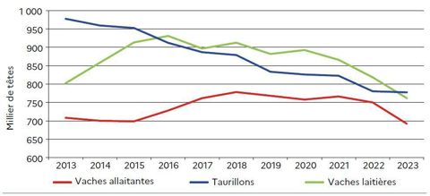 Ainsi, le cheptel perd 116 100 vaches (–1,7 %) en 2023, un repli davantage marqué pour les vaches laitières (–2 %) que les vaches allaitantes (–1,3 %). « La diminution des effectifs de vaches et de génisses de renouvellement se traduit par un nouveau recul des naissances en 2023 (–4,6 %) plus marqué qu’en 2022 (–2,3 %) ». La diminution du nombre de naissances est plus forte pour le cheptel allaitant que le cheptel laitier, et impacte la production à moyen et long terme.