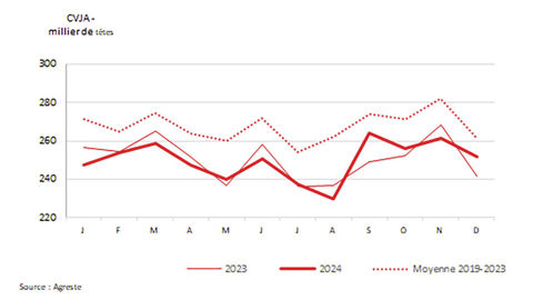 En décembre 2024, les abattoirs ont reçu 252 000 gros bovins de boucherie. L’activité d’abattage dépasse donc de 4,3 % celle de décembre 2023, mais reste inférieure de 3,7 % à sa moyenne quinquennale sur la période de 2019 à 2023.