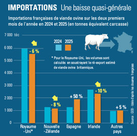 Les importations de viande ovine pour les deux premiers mois de l’année ont continué de baisser. « Elles suivent la tendance observée en 2024 avec un recul des envois en provenance du Royaume-Uni et d’Irlande, ainsi que la hausse en provenance d’Espagne, ajoute l’experte. Les envois depuis la Nouvelle-Zélande baissent alors qu’ils avaient augmenté en 2024. » La hausse de nos importations espagnoles a même atteint 50 % sur les deux premiers mois de l’année par rapport à 2024. « Et elles pourraient se poursuivre car l’Espagne a récemment perdu une grosse livraison pour le Maroc à la suite de l’annulation de la fête du sacrifice », ajoute Cassandre Matras.