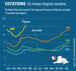 La cotation de l’agneau a poursuivi son ascension amorcée en février 2025. Avant Pâques, pendant la semaine du 14 au 18 avril, le prix moyen pondéré français fournit par FranceAgriMer a même dépassé 11 €/kg de carcasse, en s’établissant à 11,04 €/kg de carcasse, soit 0,12 €/kg net de plus que la semaine précédente et 1,48 €/kg net de plus qu’en 2024, lors de la semaine précédant la fête religieuse.