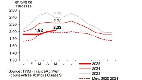 La hausse du cours du porc amorcée en mars 2025 s’est poursuivie en mai, avec une progression de 9 centimes d’euro par kilogramme de carcasse par rapport à avril 2025. À 2,03 €, le kilogramme de carcasse entrée abattoirs en mai 2025, le cours dépasse ainsi le seuil de 2 €/kg, « sans toutefois atteindre les niveaux exceptionnels de 2024 et 2023 », souligne Agreste, le service de la statistique du ministère de l’Agriculture, dans son Infos rapides du 27 juin 2025.