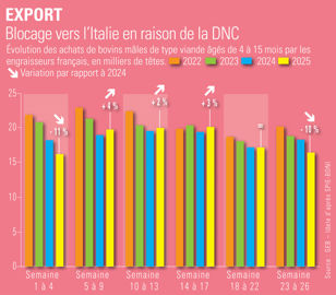 Les cours des broutards ont repris des couleurs, malgré les craintes consécutives à l’arrivée de la dermatose nodulaire contagieuse (DNC) en France, mais aussi en Italie. La zone au nord de la Botte et ses nombreux ateliers d’engraissement de jeunes bovins sont restés bloqués 45 jours après la découverte du premier foyer à la fin de juin. Impossible à partir de ce moment pour les engraisseurs italiens, d’importer des broutards.