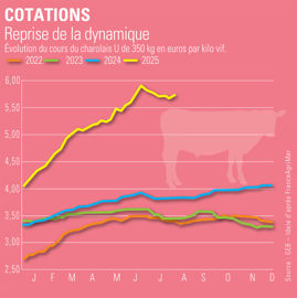 Sur ce marché, le cours moyen des charolais de 350-400 kg atteignait 6,12 € le 24 juin dernier. Il a reculé jusqu’à 5,60 € durant la première semaine de juillet, avant de rebondir à 6,17 € le 19 août. « Durant les 45 jours d’interdiction de mouvement [en Italie], les engraisseurs locaux ont continué d’abattre leurs jeunes bovins », reprend Martial Tardivon. Il y a donc, sur cette fin d'août, un léger appel d’air pour réapprovisionner les élevages vides, mais l’offre est limitée.