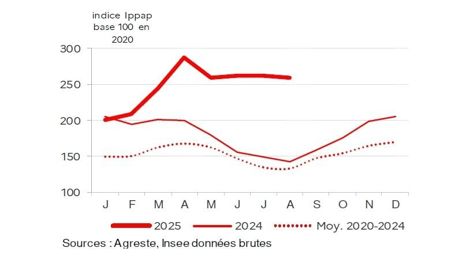 Le prix de la production de volailles de chair est pour sa part toujours plus élevé que l’an passé, enregistrant une hausse de + 2 % par rapport à la même période en 2024. En cause le prix de la viande de poulet et de la viande de dinde qui augmentent.