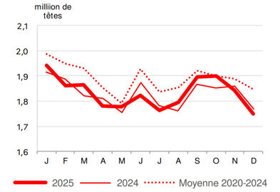 Dans le détail, les abattages de coches et de verrats ont chuté de 10,7 %, ceux des porcelets de 4 % et ceux des porcs charcutiers de 0,9 %. Ce repli des abattages de porcins en 2025 est d’autant plus important lorsqu’il est comparé à la moyenne quinquennale de 2020-2024 (- 5,4 %). En revanche, avec un poids moyen des porcs charcutier en hausse, le volume abattu est en augmentation de 0,7 % sur un an.