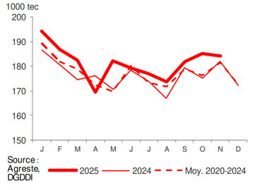 En novembre 2025, la consommation apparente de viande porcine est de 184,1 milliers de tonnes équivalent carcasse (tec) soit une augmentation de 1,2 % sur un an et de 1,4 % par rapport à 2020-2024.