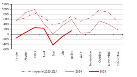 La dégradation des échanges avec les pays tiers pèse sur le solde commercial des produits bruts comme des produits transformés. « Au total, en juillet 2025, le déficit commercial des produits bruts avec les pays tiers se creuse de 61 millions d’euros à –425 millions d’euros et l’excédent des échanges de produits transformés avec ces pays recule de 317 millions d’euros à 954 millions d’euros », précise Agreste.
