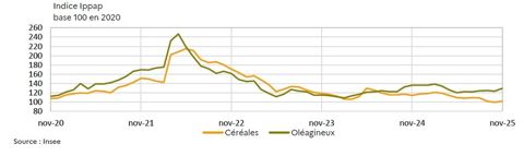 Les prix des oléagineux sont aussi en retrait sur un an, de 5,1 % en moyenne. Le recul est marqué pour les prix du colza qui baissent de 8,7 % sur un an.