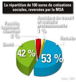 Parmi les cotisations sociales les plus importantes, se cache une prestation : la retraite des agriculteurs et des salariés. C’est le premier poste de dépenses des prestations sociales versées par la MSA. Sur 100 € de prestations, plus de la moitié (53 €) finance les allocations des 3,3 millions de retraités (dont un tiers de non-salariés agricoles).