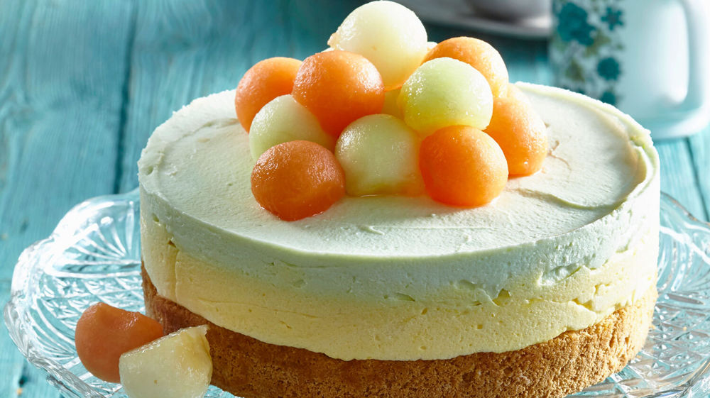 4. Dans un grand saladier, fouettez le fromage blanc et le mascarpone. Ajoutez le zeste râpé du citron vert, la chair de melon, la farine, la Maïzena et les œufs. Mélangez bien. Versez la préparation dans le moule sur le fond préparé au début.