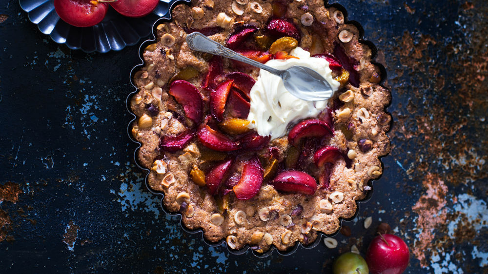 4. Versez dans un moule beurré, ajoutez au centre les prunes dénoyautées et coupées en quartiers et parsemez de noisettes concassées sur le tour. Faites cuire environ 50 minutes à 160°C.
