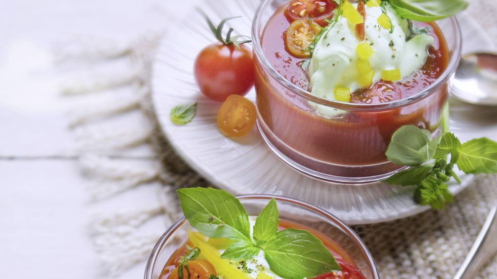 6. Sortez les verrines. Avec deux cuillères bien froides, réalisez des quenelles de chantilly, posez délicatement sur le gaspacho. Décorez de rondelles de tomates cerises, dés de poivron jaune et basilic. Donnez un tour de moulin à poivre.