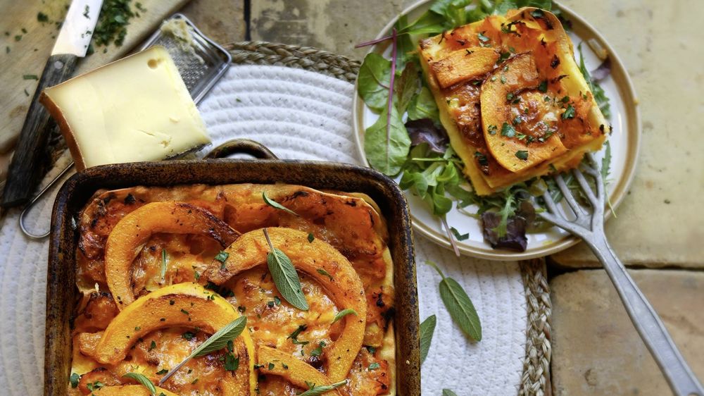 4. Faites bouillir de l’eau salée et précuire 30 secondes les feuilles de lasagne fraîches. Dans un moule à gratin beurré, déposez une couche de crème liquide, puis disposez des feuilles de lasagne, versez une couche de béchamel ainsi que de sauce tomate, répartissez 4 feuilles de sauge émincées, de l’abondance, de la pancetta et des tranches de courge. Répétez l’opération dans cet ordre plusieurs fois. Terminez par l’abondance.