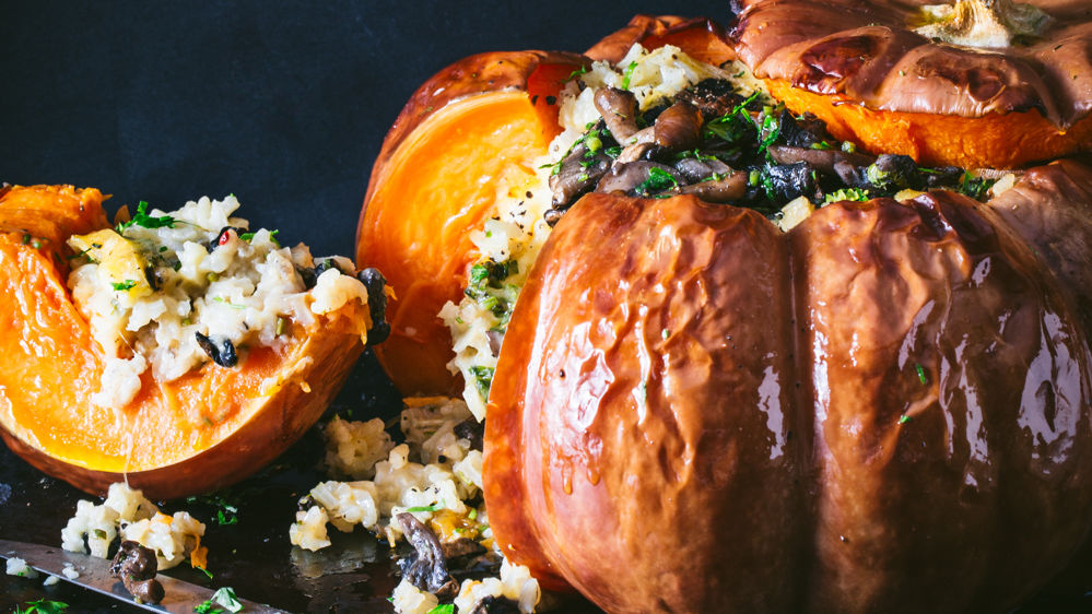 1. Lavez la courge, puis découpez un chapeau et retirez graines et filaments. Badigeonnez l’intérieur d’huile, salez et poivrez généreusement et enfournez à 200°C pour 45 minutes.
