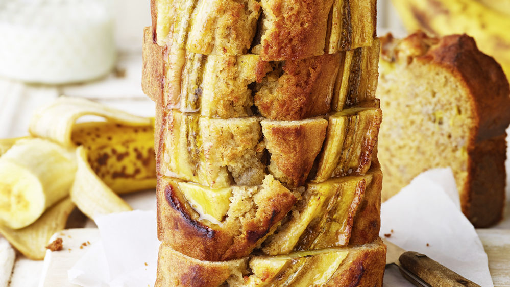 4. Épluchez et coupez la banane restante en deux et posez-la sur le dessus du cake, face coupée au-dessus.