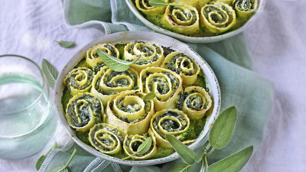 7. Déposez de la farce d’épinards sur chaque bande et roulez avant de les déposer bien serrées dans chaque petit plat.
