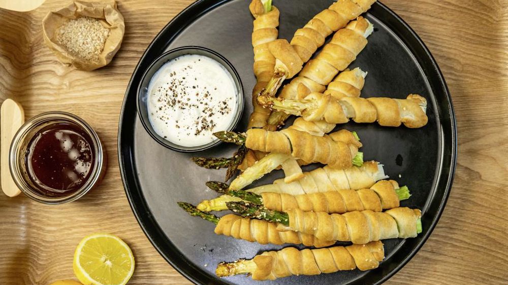 2. Coupez le feuilletage en 12 lanières. Torsadez chaque bande autour de l’asperge. La pointe de l’asperge dépasse ainsi de quelques centimètres du feuilletage.