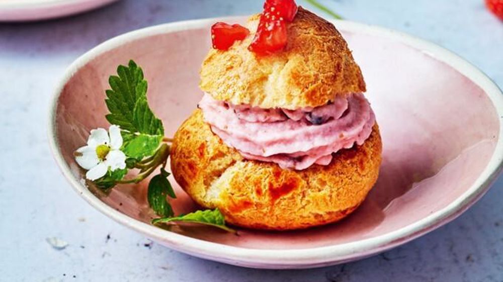 7. Pour le montage, taillez un chapeau dans les choux, garnissez-les de mousse aux fraises, refermez-les et décorez-les de fraises.