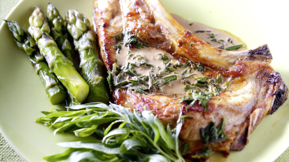 4. Servez les côtes de veau nappées de la sauce à l’estragon et accompagnées d’une purée de pommes de terre et d’asperges vertes.