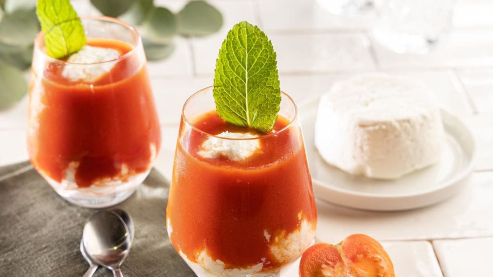 - Gaspacho au chèvre frais (en photo) : versez du gaspacho tout prêt acheté dans le commerce et terminez par une quenelle de chèvre frais (de type Petit Billy). Servez bien frais.