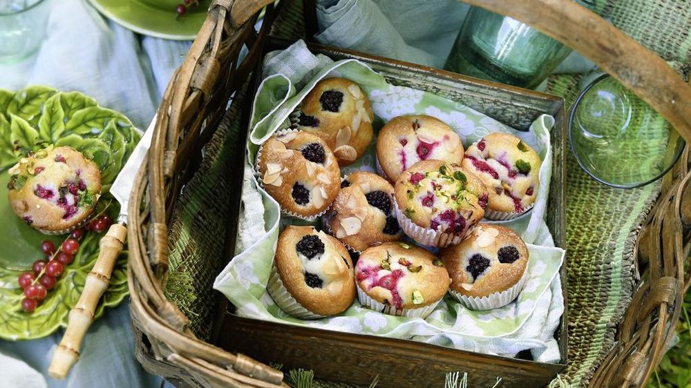 6. Faites de même avec la pâte à muffins à la mûre et la crème d’amande, parsemez du reste de mûres.