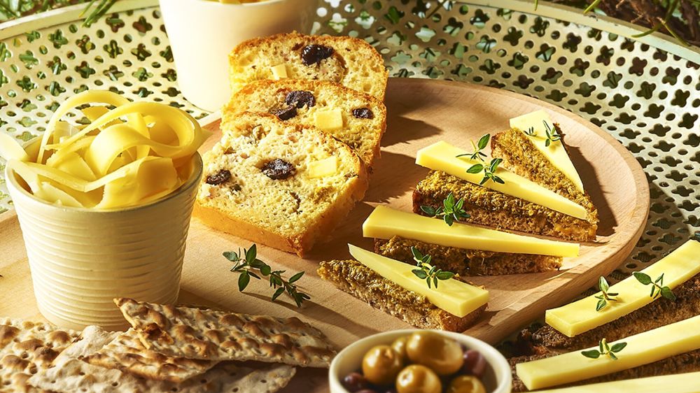 8. Sur une planche en bois, placez les toasts tapenade/beaufort, quelques tranches de cake, les olives vertes, les olives noires, les crackers apéritifs, et les bâtonnets de beaufort.