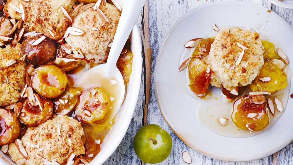 4. Versez des cuillerées de pâte sur les prunes, parsemez du reste des amandes grossièrement concassées et d’un peu de cannelle.