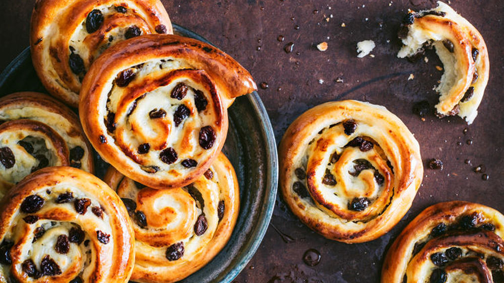 3. Étalez la moitié de la pâte sur le plan de travail huilé en un rectangle de 30x40 cm environ, avec le petit côté vers vous. Étalez dessus la moitié de la crème en laissant 2 cm libres en bas, puis parsemez de la moitié des raisins égouttés. Enroulez la pâte serrée vers vous, puis coupez-le boudin obtenu en 10 escargots. Déposez-les sur une plaque recouverte de papier cuisson. Répétez l’opération avec le reste de pâte, de crème et de raisins.