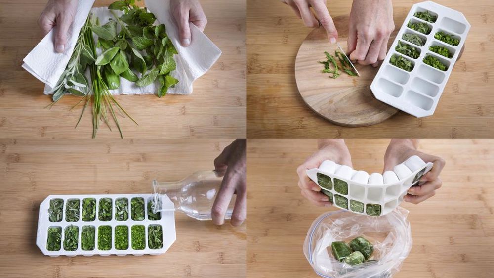 Lavez les herbes, puis égouttez-les ou séchez-les. Ciselez-les finement avant de les tasser dans des bacs à glaçons. Complétez avec un peu d’eau puis placez au congélateur. Une fois pris, ensachez les cubes d’herbes et replacez-les au congélateur. Ceux-ci agrémenteront potage, purée, risotto, vinaigrette, sauce, bouillon, pâtes, riz ou plats cuisinés.