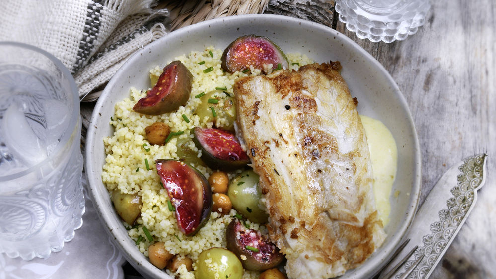 5. Dressez dans quatre assiettes creuses la semoule et la sauce. Déposez le poisson dessus. Répartissez les figues.